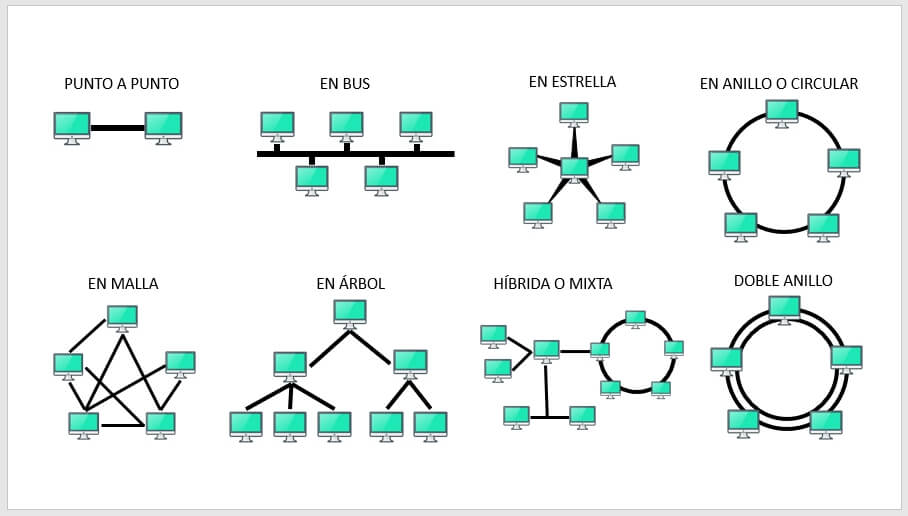 - Topología en Anillo: Los dispositivos forman un anillo. La información circula en un solo sentido. Si una computadora falla, se interrumpe la red.