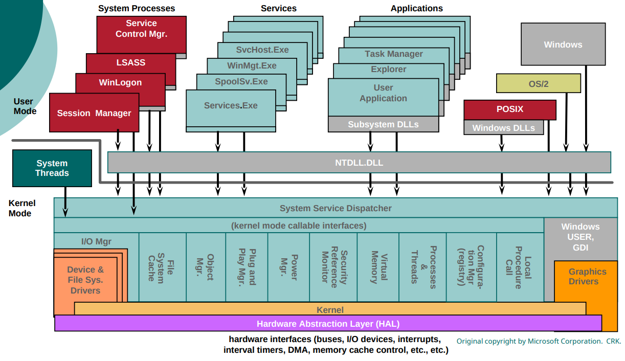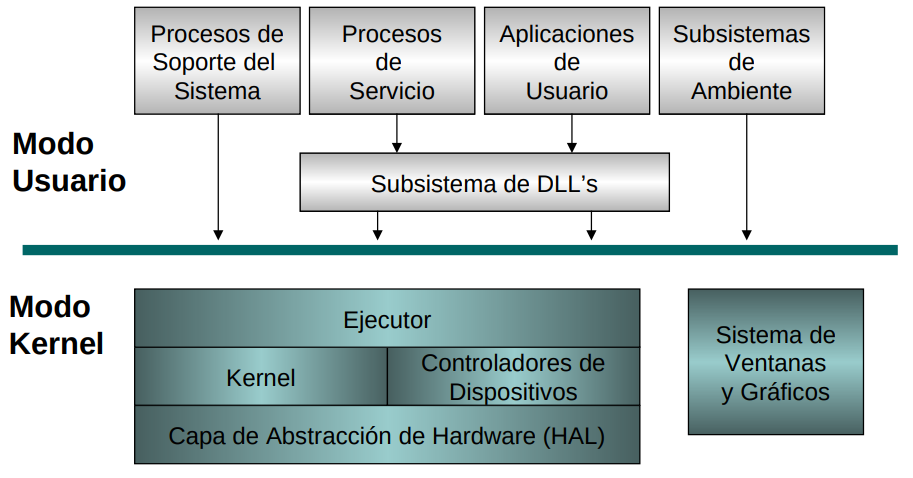 - Subsistema de DLLs (Dynamic-Link Libraries): Traduce las peticiones de las aplicaciones en llamadas internas al sistema operativo.